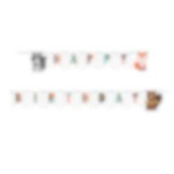 Stor girlang av papp med texten "Happy Birthday" och med motiv av en tvättbjörn, en räv och en bäver från temat Woodland Animals. Pynta väggen med denna när du ska ha kalas med Woodland Animals som tema. Girlangen är ca 2,50 meter lång och motiven är ca 15 cm stora.