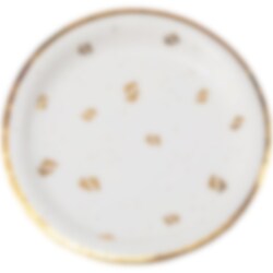 8 st. papptallrikar med motiv av guldfolierade avtryck av babyfötter samt prickar på en vit bakgrund. Även tallrikarnas kanter är guldfolierade. Ett passande tillbehör att duka fram inför babyshowern eller dopet. Tallrikarna är gjorda av FSC-papper och är 23 cm i diameter.