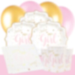 Detta färdiga kalaspaket till för babyshower eller dop inkluderar 10 stycken lyxiga tallrikar med guldfolierade kanter (21 x 21 cm), 10 st. söta pappmuggar (270 ml) och 20 st. vackra servetter med texten "Girl" (33 x 33 cm) utöver det så ingår 10 st. guldmetallic ballonger och 10 st. rosa ballonger samt en rosa bordsduk av plast (137 x 274 cm).