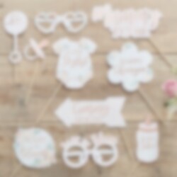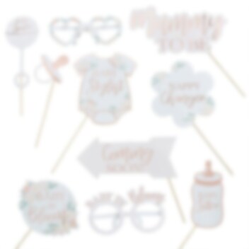 10 st. olika fina photo props i tjusiga färger med babymotiv från kollektionen "Baby in Bloom". Perfekta att ha med på Babyshowern för att ta oförglömliga kort tillsammans med gästerna.