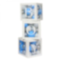 Ballongboxar Boy innehåller 3 st. dekorativa boxar i papper och plast som bredvid varandra bildar ordet "BOY". Lådorna mäter alla 35 x 35 x 35 cm och ballonger medföljer ej.