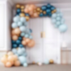 Tjusig ballongbåge i blågrön-, persika och guld chromefärgade toner som du själv bygger ihop. En verkligt imponerande dekoration som passar både till kalas, fester eller bröllop. Förpackningen innehåller hela 200 st. ballonger i olika storlekar och tillbehör. Ballongbågen är ca 12 meter lång.