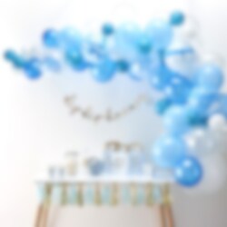 Imponerande ballongbåge i blåfärgade toner som du själv bygger ihop. En vacker dekoration som passar både till kalas, fester eller bröllop. Förpackningen innehåller hela 70 st. ballonger i olika storlekar och tillbehör. Ballongbågen är ca 4 meter lång.