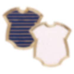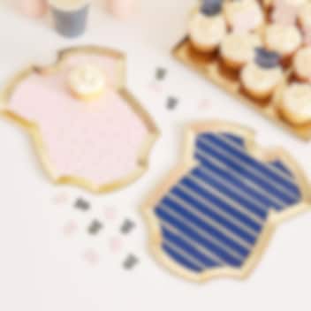 8 st. papptallrikar som är formade som baby bodies i färgerna ljusrosa och mörkblå med guldfolierade kanter, prickar och ränder. Perfekta att ha med till dukningen inför Gender Reveal partyt. Tallrikarna är ca 25,5 x 18 cm stora.