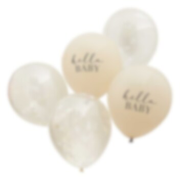 5 st. latexballonger med skriften "Hello Baby" på utsidan av 2 st. av ballongerna och där resterande ballonger även är fyllda med vit molnformad konfetti. Dekorera rummet med dessa för att göra det extra tjusigt inför babyshowern. Ballongerna är ca 30 cm i diameter uppblåsta och kan blåsas upp med vanlig luft eller helium.
