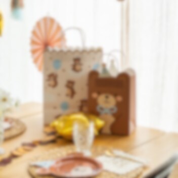 En gullig liten presentpåse av papper med motiv av ett teddybjörnsansikte. Presentpåsen är 18 x 29 cm stor.