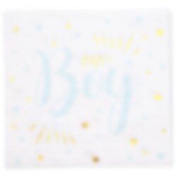 20 st. servetter i en vit färg med fina detaljer i ljusblått och guldfolierade detaljer och med texten Baby Boy. Supersnygga att duka med på ditt dop eller om du ska överraska en nybliven mamma med en babyshower.