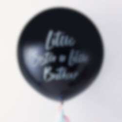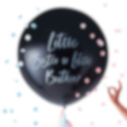 Stor och fin svart ballong med motiv av texten "Little Sister or Little Brother?". En rolig dekoration att ha på en Gender reveal fest eller Babyshower. Förpackningen inkluderar förutom ballongen även blå och rosa papperskonfetti och 1 st. rosa tassel och 1 st. blå tassel som du kan fästa under ballongen. Instruktioner på hur du gör står på baksidan av förpackningen. Ballongen blir ca 60 cm i diameter uppblåst och blåses lättast upp med helium.