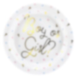6 st. vita papperstallrikar med motiv av rosa hjärtan, blåa stjärnor och frågetecken och texten "Boy or Girl?" i guldfolie. Perfekta att ha med till din Babyshower. Tallrikarna är ca 23 cm i diameter.