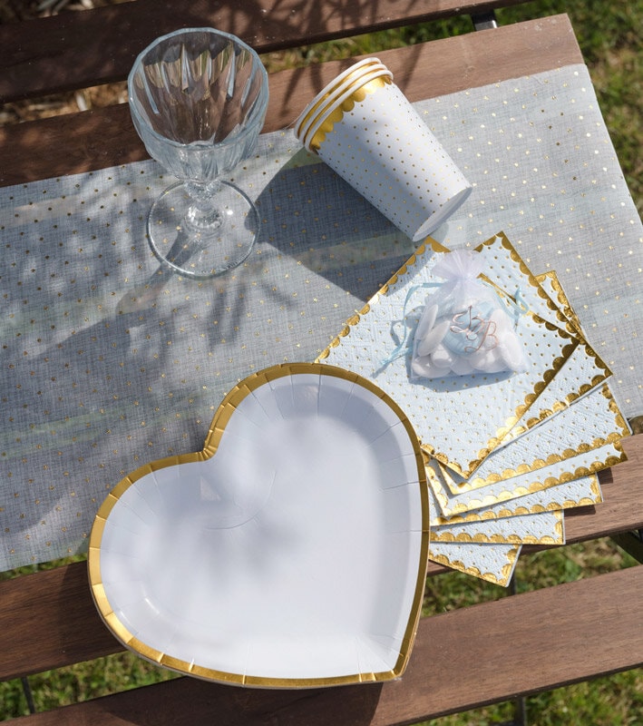 10 st. hjärtformade tallrikar i en fin ljusblå färg med guldfolierad kanter. Superfina tallrikar att duka med på ditt kalas, babyshower eller till dopet. Tallrikarna är ca 22.5 x 20 cm stora.