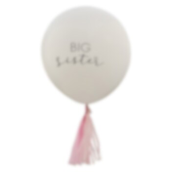 Stor vit ballong med texten ''Big Sister'' och som har fina rosa tofsar. Ballongen blir 45 cm i diameter uppblåst och du får med 2 st. rosa tofsar.