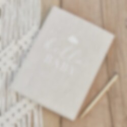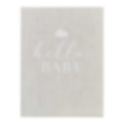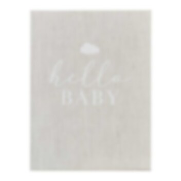 Jättefin inbunden journalbok med linnetyg och texten "Hello Baby" i vit färg på framsidan.