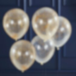 5 st. transparenta ballonger som är fyllda med hårliknande konfetti i guldfärg från kollektionen Pop The Bubbly. En vacker dekoration att ha med till varje kalas eller fest. Ballongerna blir ca 30 cm i diameter när dem är uppblåsta och kan blåsas upp med både vanlig luft eller helium. Gnugga ballongen mot något tyg för att uppnå statisk elektricitet, på så sätt fastnar konfettin på insidan av ballongen.