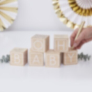 Roligt alternativ till den traditionella gästboken i form av sex stycken träklossar av naturligt trä. Klossarna har tryck i vitt på ena sidan och bildar orden Oh Baby. Klossarnas övriga sidor är tomma och har plats att skriva både lyckönskningar, små meddelanden och goda råd på.