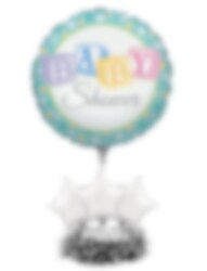 Snygg bordsdekoration i glada färger med ballonger och med texten "Babyshower". Bygg ihop bordsdekorationen genom att sätta ihop basen, blåsa upp ballongerna runt den och sätta dit dem med medföljande ballongpinnar. Bordsdekorationen blir ca 61 x 46 cm stor när den är ihopsatt. Ballongerna kan blåsas upp med vanlig luft.