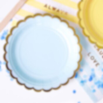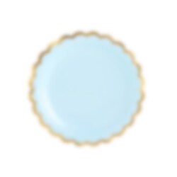 6 st. pappassietter med ljusblå bakgrund och guldfolierade kanter. Fina att duka fram inför kalaset eller babyshowern. Assietterna är ca 18 cm i diameter.
