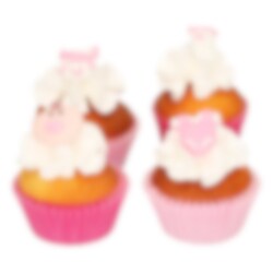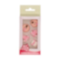 8 st. sockerdekorationer som föreställer rosa babysaker. Roliga att dekorera tårtan eller bakelserna med när det vankas Babyshower.