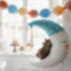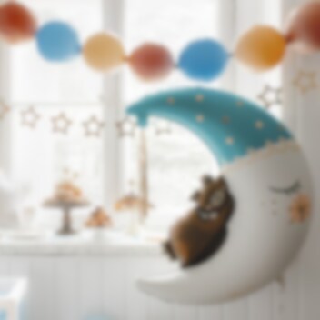 Dekorativ folieballong som föreställer en halvmåne med en sovande teddybjörn som garanterat blir uppskattad till varje Babyshower party. Ballongen är 80 x 98 cm stor uppblåst och blåses upp med helium eller luft.