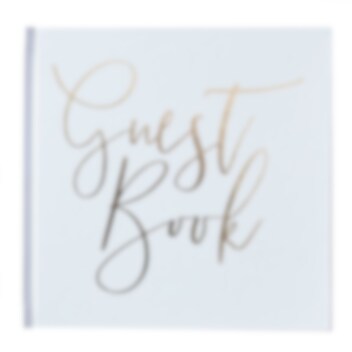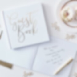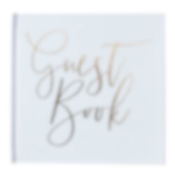 Vacker gästbok från med hård pärm i vitt och tryckt guldfolierad text. Gästboken består av 32 blanka blad och är ca 20 x 20 cm stor. Boken kan med fördel användas på både dop och babyshower.