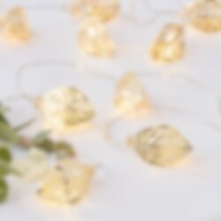 Vacker girlang med motiv av guldblad som har LED belysning. En tjusig dekoration till varje kalas, fest eller bröllop. Girlangen är ca 1,5 meter lång och drivs av 2 st. AA batterier som inte är inkluderade.