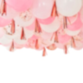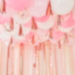 160 x ballonger i färgerna rosa och vit samt ballonger med roséguld konfetti i storlekarna 30,48 och 12,7 cm i diameter.