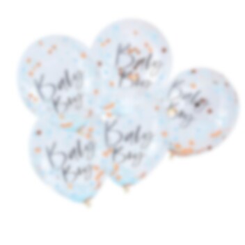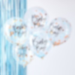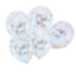 5 st. ballonger fyllda med roséguld och blå konfetti och även med texten "Baby Boy" utvändigt. En härlig dekoration till din Babyshower. Ballongerna blir ca 25 cm i diameter uppblåsta.