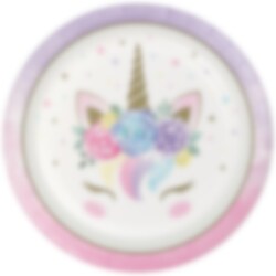 8 st. papptallrikar med pastellrosa/lila kanter och en vit bakgrund samt med motiv av en färgglad enhörning och stjärnor. Tallrikarna är ca 22 cm i diameter.