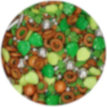 Ge dina bakverk en vild och exotisk touch med denna djungelinspirerade strösselmix! En spännande kombination av gröna blad, träfärgade ringar och skimrande detaljer skapar en äventyrlig dekoration för cupcakes, tårtor och andra godsaker. Perfekt för djungelkalas och temabakning.