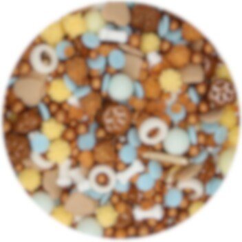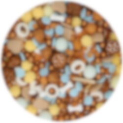 Skapa bakverk fyllda med kärlek med denna charmiga strösselmix! En lekfull kombination av ljusblå, bruna och gyllene dekorationer, inklusive små hundben och hjärtan, gör den perfekt för djurälskare och temakalas. Passar utmärkt för cupcakes, tårtor och andra godsaker.