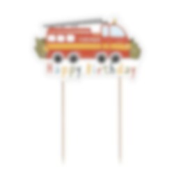 Cake topper som har motiv av en brandbil samt texten "Happy Birthday" i glada färger. Höjd 19 cm.