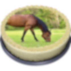 Tårtbild av sugarpaste med hästmotiv. Skapa enkelt en snygg tårta till kalaset. Tårtbilden är ätbar och färdig att läggas på tårtan. Storlek: Tårtbilden är ca 20 cm i diameter. Förvaring: Förvaras torrt och svalt och har en hållbarhet på ca 1 år.