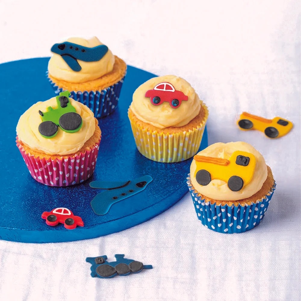 Sockerdekorationer i form av fem olika fordon: ett tåg, en traktor, en bil, en lastbil och ett flygplan. Använd dessa färggranna dekorationer för att enkelt pryda tårtor, muffins eller andra bakverk.