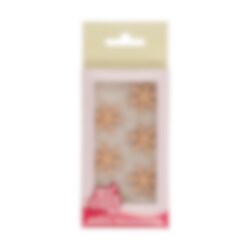 12 st. sockerdekorationer som är formade som snöflingor i guldfärg. Perfekta att dekorera alla olika bakverk med. Snöflingorna är ca 2,6 cm stora.