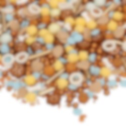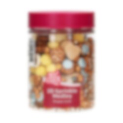 Skapa bakverk fyllda med kärlek med denna charmiga strösselmix! En lekfull kombination av ljusblå, bruna och gyllene dekorationer, inklusive små hundben och hjärtan, gör den perfekt för djurälskare och temakalas. Passar utmärkt för cupcakes, tårtor och andra godsaker.