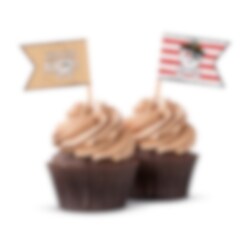 Dekorera extra festligt med dessa muffinsdekorationer i pirattema. De små flaggorna har två olika motiv, ett med texten "Hip Hip Ahoy!" på en bakgrund som liknar en gammal skattkarta och ett med dödskalle, pirathatt och röda ränder, vilket gör dem till en lekfull detalj på muffins, cupcakes och andra godsaker.