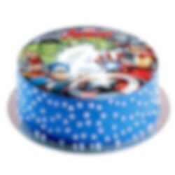 Cool och färgglad tårtbild av oblat med motiv av superhjältarna Hulken, Thor, Iron Man och Captain America från Avengers. Baka en egen personlig tårta till barnkalaset. Bilden som är 20 cm i diameter är enkel att använda. Tårtbilder av oblat är gluten- och laktosfria och har inget tillsatt socker. Passar för vegetarianer.
