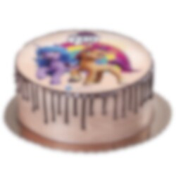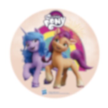 Tårtbild av oblat med motiv av gulliga hästar från filmen My Little Pony. Baka en egen tårta till barnkalaset med My Little Pony eller hästar som tema och placera din oblat på toppen. Bilden som är 20 cm i diameter är enkel att använda. Tårtbilder av oblat är gluten- och laktosfria och har inget tillsatt socker. Passar för vegetarianer.