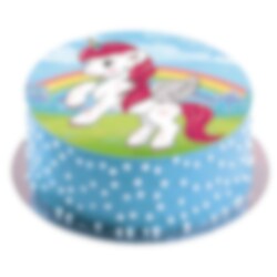 Underbart vacker tårtbild av god sockerpasta med sött enhörningsmotiv. Tårtbilden är färdig att läggas direkt på tårtan och har ett skarpare och mer detaljerat tryck än vad en oblatbild har. Dessutom har bilden en god vaniljsmak. Bilden är ca 20 cm i diameter.