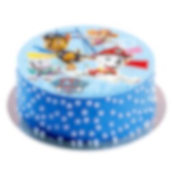 Färgglad tårtbild av god sockerfri fondant med motiv av karaktärerna från Nickelodeons Tv-serie Paw Patrol. Tårtbilden har en mild vaniljsmak och är färdig att läggas på tårtan. Bilden är ca 16 cm i diameter.