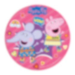 Tårtbild av god sockerfri fondant med gulligt motiv av Peppa Pig och Emily Elephant framför en färgglad bakgrund från TV-serien Peppa Pig. Tårtbilden är färdig att läggas direkt på tårtan och har ett skarpare och mer detaljerat tryck än vad en oblatbild har. Dessutom har bilden en god vaniljsmak. Bilden är ca 20 cm i diameter.