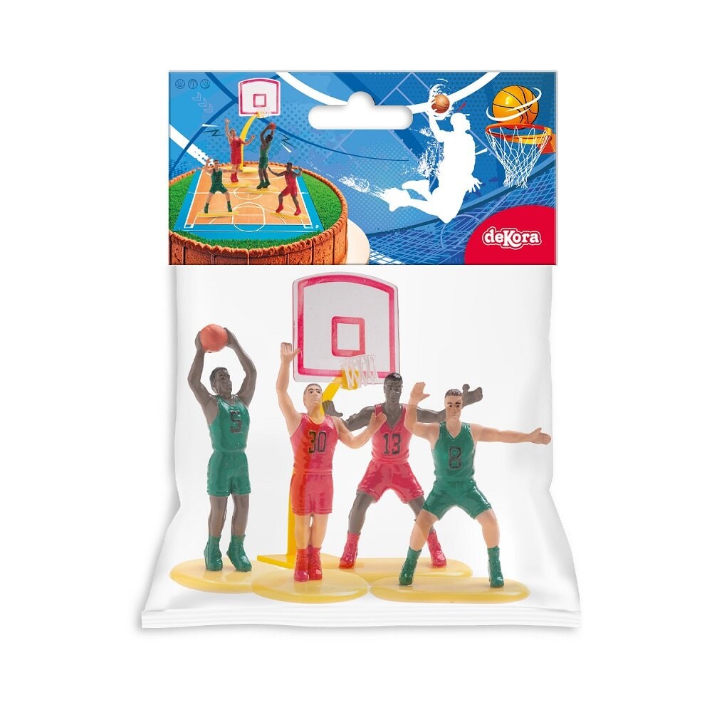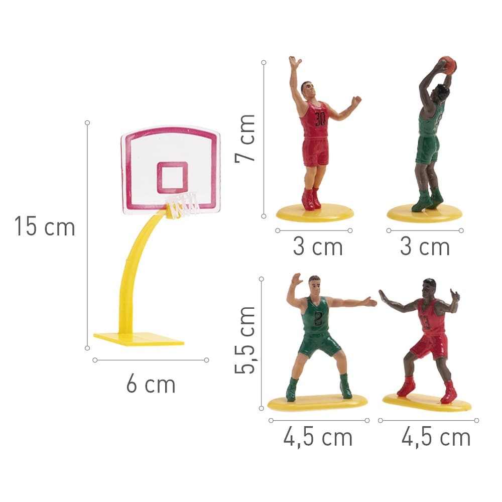 Setet innehåller en basketkorg och fyra basketspelare i olika positioner som placeras direkt ovanpå tårtan. Basketkorgen är cirka 15 cm hög och spelarna är ungefär 5,5-7 cm höga, vilket gör dem till ett riktigt blickfång på tårtan. Perfekt till ett sportkalas, ett basketkalas eller för alla som älskar basket.