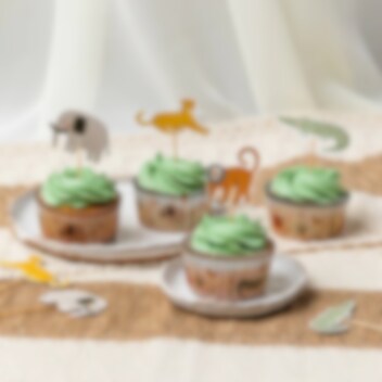 12 st. cake toppers med safaridjur i olika storlekar. Perfekta om du vill dekorera dina cupcakes, tårtor eller andra bakverk. De är tillverkade av papp och trä och har en höjd på ca 8 cm.