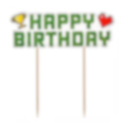 Tuff cake topper dekoration som bildar orden "Happy Birthday" och som har motiv av olika spelrelaterade prylar. Cake toppern är 14 cm hög.
