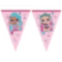Dekorativ girlang tillverkad av papper i rosa nyanser och med motiv av dockorna Crystal Queen, Luxe och Splash Queen och texten "Happy Birthday" i färgerna rosa och pastellblå på ena sidan. En vacker dekoration att hänga upp på väggen när det vankas kalas med LOL Surprise som tema. Girlangen är ca 2 meter lång.