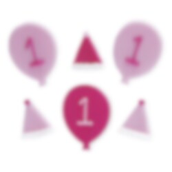 6 st. sockerdekorationer som förställer ballonger och hattar i rosa nyanser med motiv av siffran "1". Utmärkta att ha med i bakningen inför 1-årskalaset.