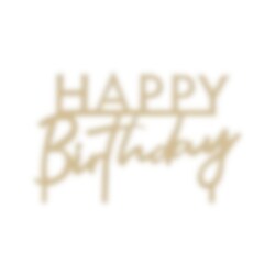 Tårtdekoration i en guld akrylfärg som bildar orden "Happy Birthday". Den ultimata dekorationen att pynta tårtan med inför alla kalas. Tårtdekorationen är ca 10 cm hög.