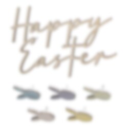 Sätt pricken över i:et på påskfirandet med denna "Happy Easter" tårtdekoration i trä. Förutom skylten medföljer även fem söta kaninhuvuden i trä.