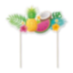 Ge tårtan en färgstark och somrig känsla med denna fina tårtdekoration med tropiska frukter och blad. Motivet med ananas, vattenmelon, kokosnöt, blommor och gröna blad passar perfekt till sommarfest, hawaiikalas, poolparty eller andra firanden med tropiskt tema.