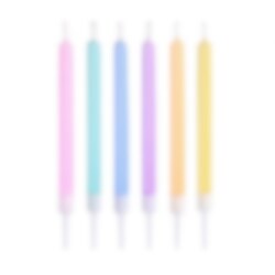 Dessa tårtljus i fina metallic pastellfärger är det perfekta tillägget till varje festlig tårta. Varje förpackning innehåller 6 tårtljus som har en höjd på 12,5 cm och det ingår även 6 stycken hållare för enkel användning.