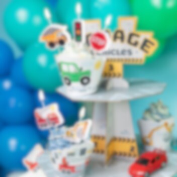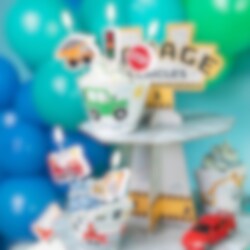 Dessa tårtljus med en brandbil, grävmaskin, dumper, stoppskylt och trafikljus gör födelsedagstårtan extra rolig för alla små fordonsfantaster. Ljusen är 3-4 cm stora och fästa på praktiska träpinnar för enkel placering i tårtan.
